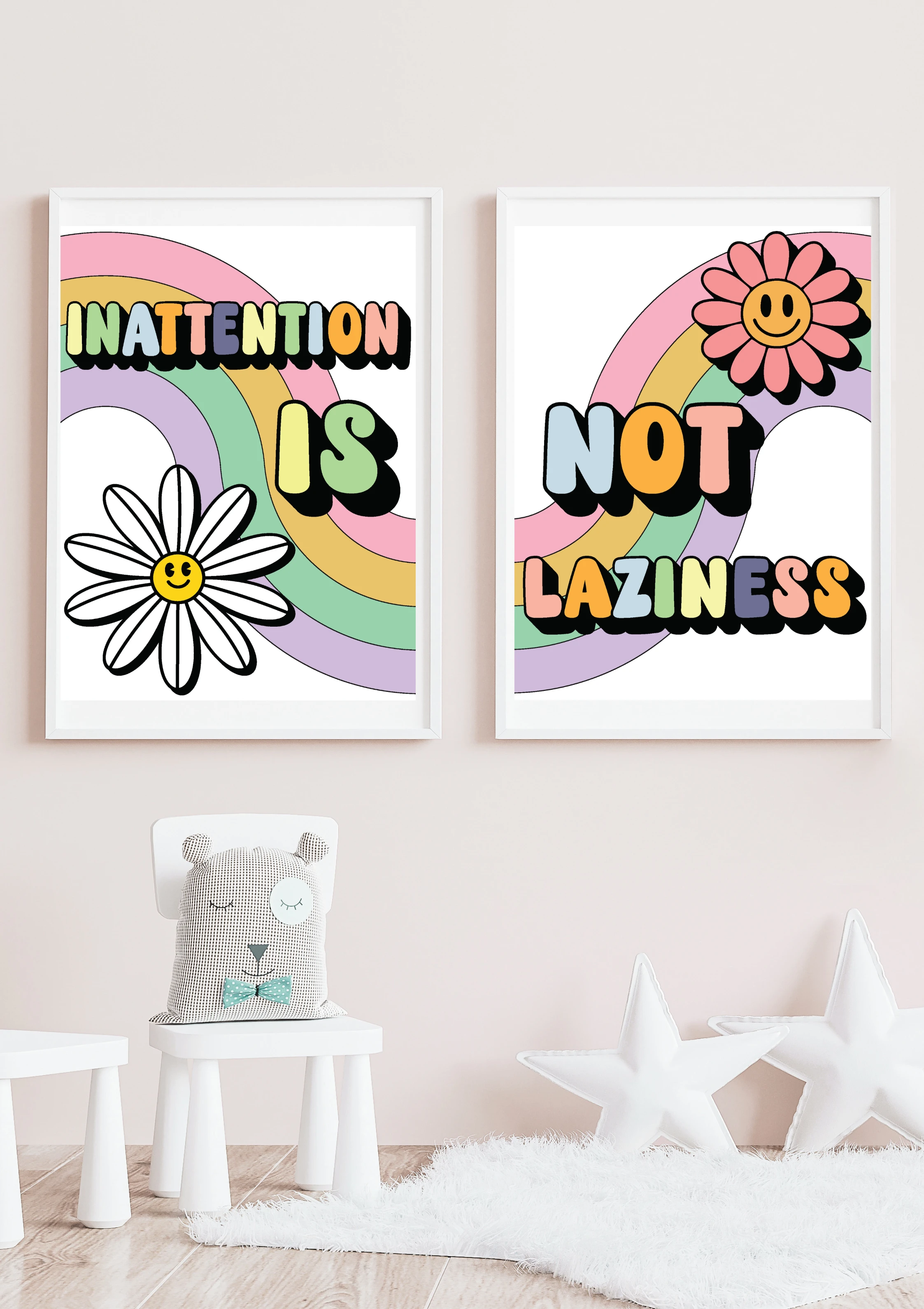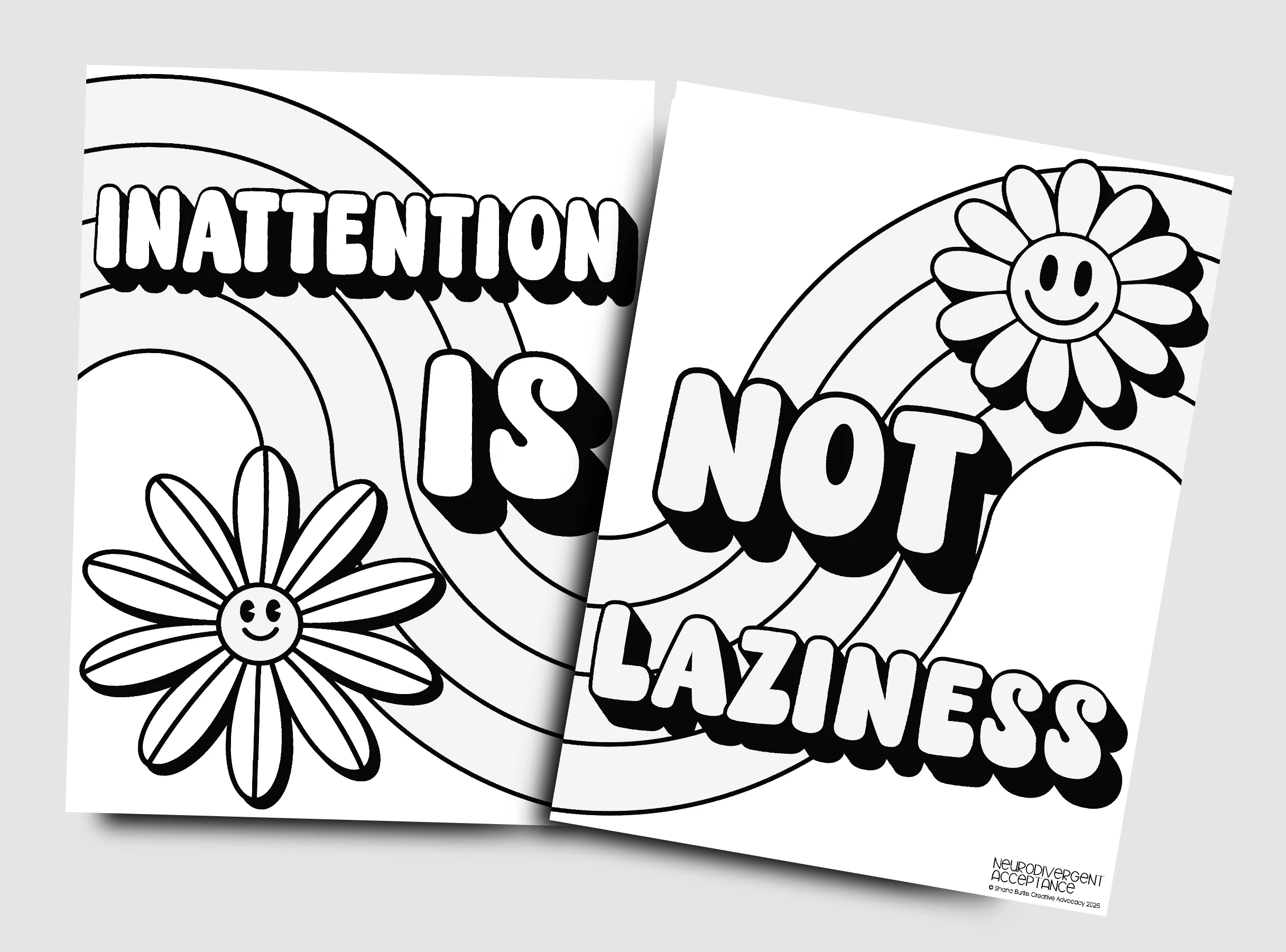 ✶2 high-resolution full-color “Inattention Is Not Laziness” coordinating posters (8.5 x 11 in, PDF) for printing at home, school, or your local print shop.